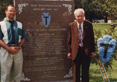 Buddy Sinclair and George Cone at the unveiling of the 36th Division memorial in Dallas. It was donated by Buddy and Katie Sinclair in September 1996. Buddy would invite us to fish on Lake Fork where he lived. We spent many a pleasant hour chatting and fishing. He has since passed.