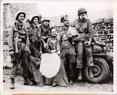 These paratroopers jumped on Normandy where they were captured. This picture was taken after they were "liberated." I cannot give the circumstances of that action. Notice the captured German pistols displayed and other German gear.