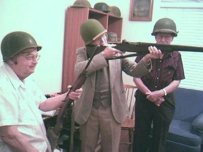 I invited a few vets over for dinner. Left is Danny Thomas of Iwo Jima and the book Flags of Our Fathers. Danny said he carried a carbine when he landed but threw it away as he could not tend to the wounded and carry it too. JW Thomas is shouldering his old weapon and Don McGregor symbolizes the POW that he became. As it turned out both McGregor and JW Thomas were in the 103rd Infantry Division. McGregor was captured in Selestadt after German tanks pumped 88 rounds into his building at point blank range. He was wounded and taken prisoner. I showed them some stuff and they seemed to enjoy the souvenirs so we goofed off for a while. What a great bunch of men!
